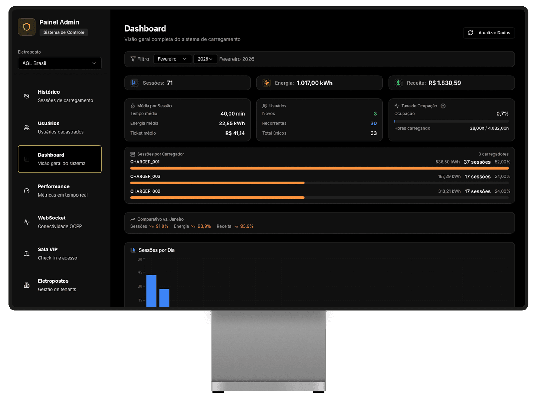 Esse valor inclui o acesso completo à plataforma de gestão da AGL, permitindo que o operador controle e monitore seu carregador de forma simples e eficiente.